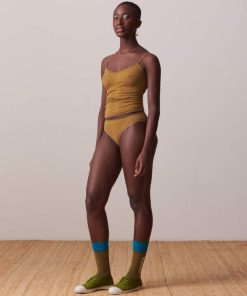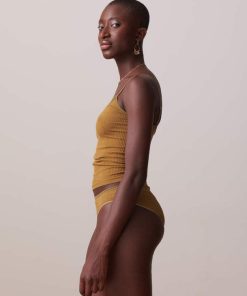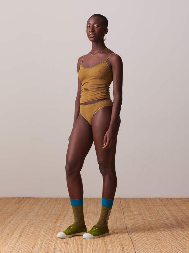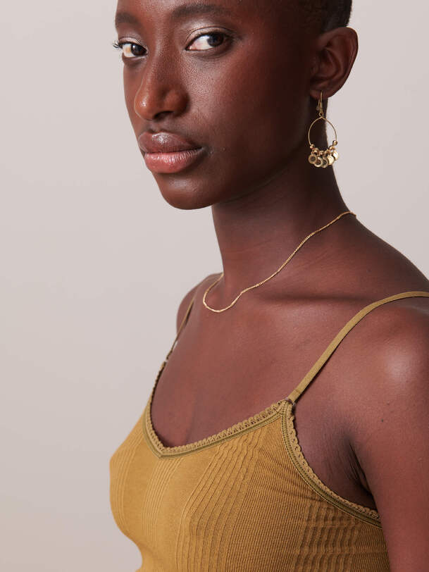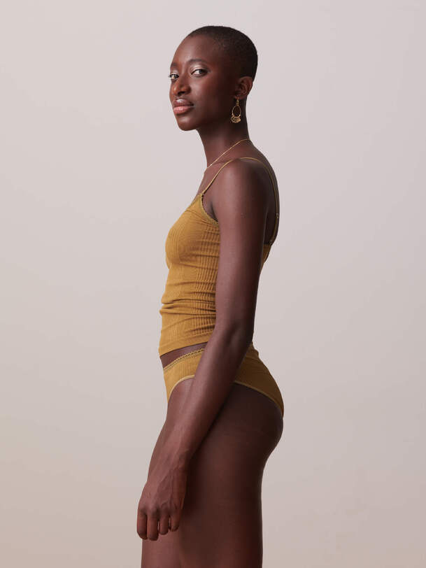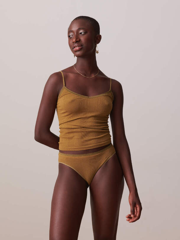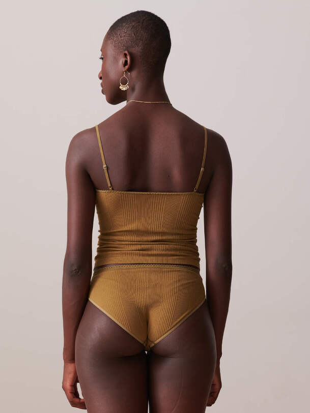 Ribbed lingerie top with thin, adjustable straps. The neckline is adorned with a scalloped edge. Diagonal ribbing adds a graphic touch.