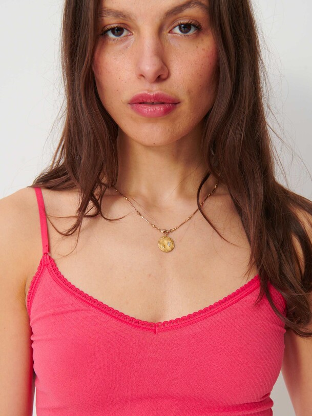 Ribbed lingerie top with slim, adjustable straps. The neckline features a scalloped edge. Diagonal ribbed patterns add a graphic touch.