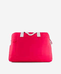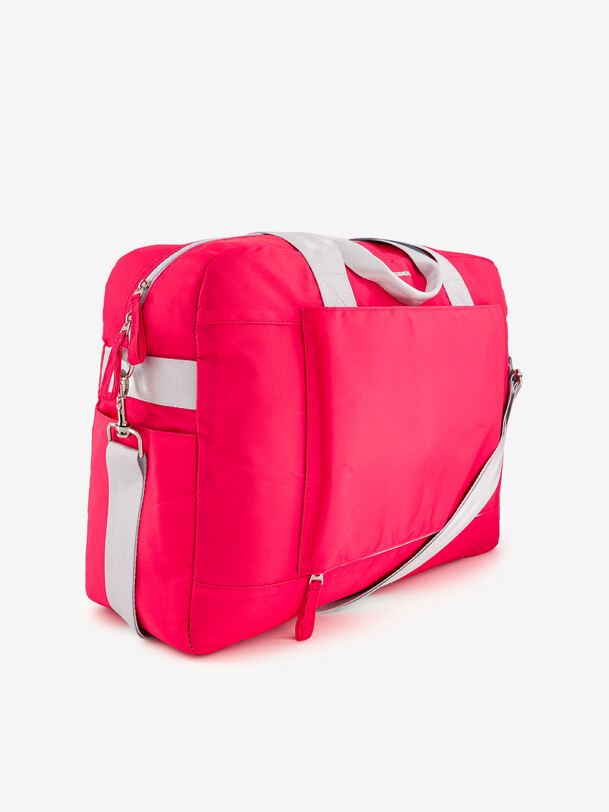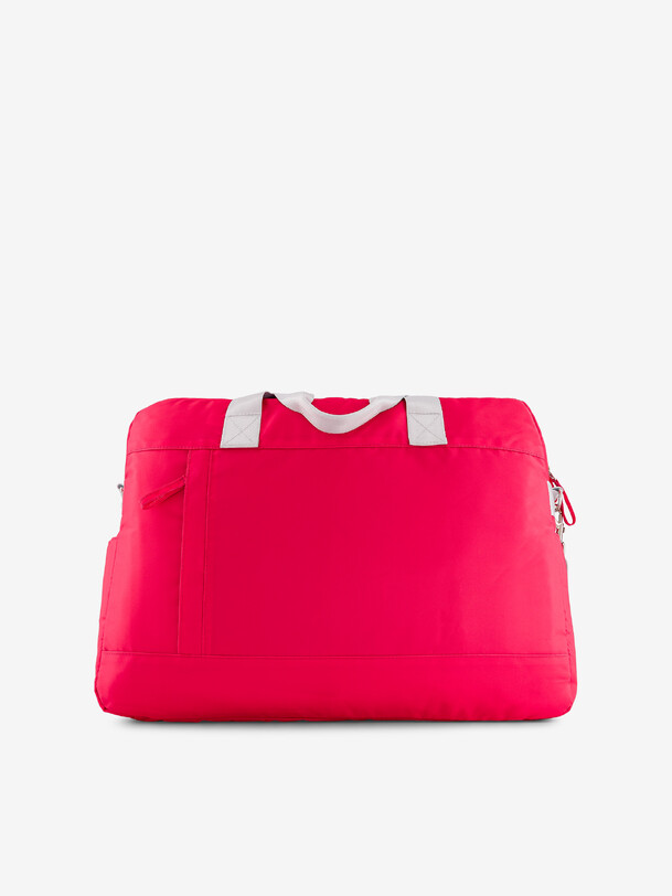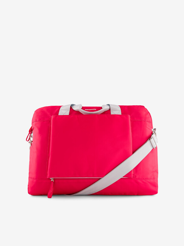 Large capacity weekend bag with zip closure. It has numerous pockets: a large capacity zipped pocket, two side pockets, a front zipped pocket for suitcase handle, a back zipped pocket, two inside Velcro pockets and an inside zipped pocket. The double handle and the removable adjustable handle ensure optimal practicality. Its dimensions: length 47 cm, width 13 cm, height 35 cm.